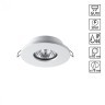 Корпус из металла в белом цвете гармонично вписывается в современные интерьеры, а компактные габариты (диаметр 85 мм, высота 23 мм) позволяют монтировать светильник даже в ограниченном пространстве. Для установки требуется врезное отверстие 70×70 мм — такой размер обеспечивает быстрый монтаж без сложных подготовительных работ.