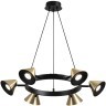 Каркас светильника изготовлен из металла с матовым покрытием в черном и золотом цветах. Шесть глянцевых плафонов золотого оттенка добавляют роскоши, не перегружая пространство. Диаметр конструкции — 635 мм, а высота регулируется до 1000 мм, что позволяет адаптировать светильник под разные потолки.