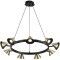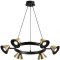 Каркас светильника изготовлен из металла с матовым покрытием в черном и золотом цветах. Шесть глянцевых плафонов золотого оттенка добавляют роскоши, не перегружая пространство. Диаметр конструкции — 635 мм, а высота регулируется до 1000 мм, что позволяет адаптировать светильник под разные потолки.