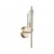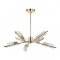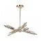 Арматура из металла с глянцевой золотой поверхностью создает эффект сияния, а прозрачные стеклянные плафоны подчеркивают легкость конструкции. Такой дуэт материалов делает люстру универсальной: она сочетается с пастельными тонами и контрастными акцентами, подходит для помещений с высокими и стандартными потолками.