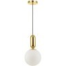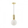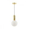 Абажур из матового стекла в белом оттенке гармонично контрастирует с глянцевой золотой арматурой. Такая комбинация материалов добавляет интерьеру лёгкости, а металлическая основа обеспечивает долговечность конструкции. Светильник рассчитан на лампу с цоколем E27 мощностью до 40W, что позволяет подобрать подходящий вариант — от тёплого до нейтрального свечения.