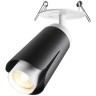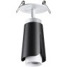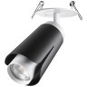 Корпус из матового металла в белом цвете выглядит нейтрально, а поворотный плафон черного оттенка добавляет контраста. Благодаря углу поворота 340° свет легко направить в нужную зону, а матовая поверхность плафона создает мягкое рассеивание без бликов. Светильник монтируется в отверстие диаметром 75 мм — это стандартный размер для большинства подвесных потолков.