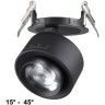 Корпус из черного металла с диаметром 80 мм выглядит лаконично, а поворотный механизм на 340° позволяет направлять световой поток под нужным углом (15-45°). Монтаж упрощает стандартное врезное отверстие 75×75 мм и небольшая высота встройки — всего 32.5 мм. Несмотря на компактные габариты (90×90×72.5 мм), модель сочетает прочность и эргономику.